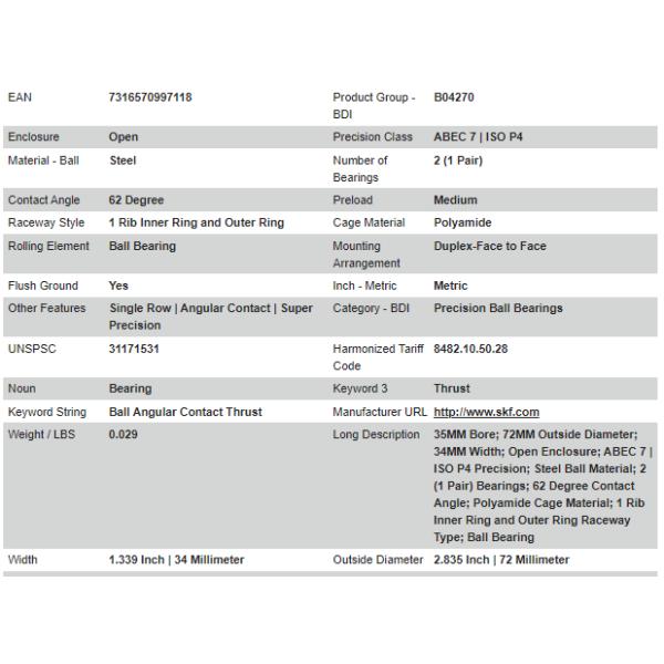 35MM Bore; 72MM Outside Diameter; 34MM Width; Open Enclosure; ABEC 7 | ISO P4 Precision;